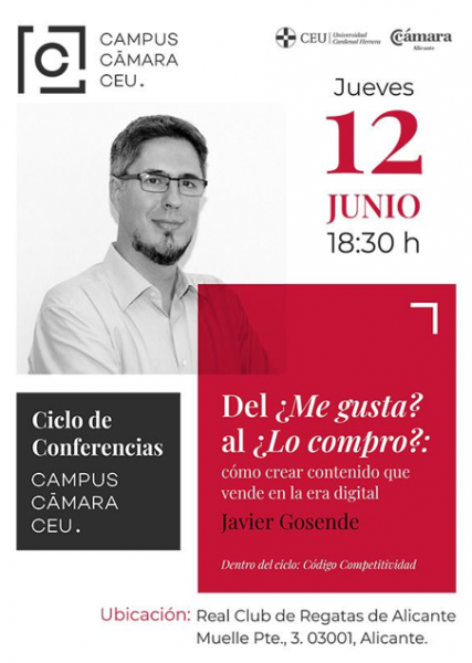 Confirme su asistencia aquí :https://www.camaralicante.com/eventos/GPRES25009CAFA/Conferencia-Campus-Camara-CEU-con-Javier-Gosende-Del-Me-gusta-al-Lo-compro-/