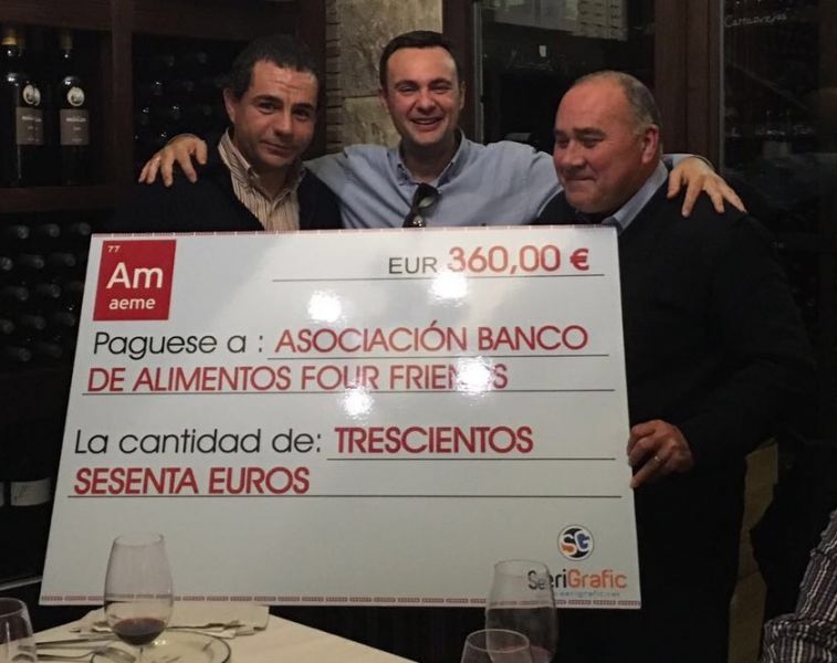 Pablo Plaza presidente de la asociación de empresarios del metal de Elche, entrego el sábado 27 de febrero la donación de los empresarios de AEME recogida durante la pasada campaña de Navidad. La cantidad recaudada irá destinada a la Asociación: "Banco de Alimentos Four friends" .Recibió el cheque su representante Juan Manuel Martínez acompañado por Jose Antonio, párroco de la Iglesia de los Desamparados de Elche, quien se encargará de hacer llegar la donación a quien más lo necesite.