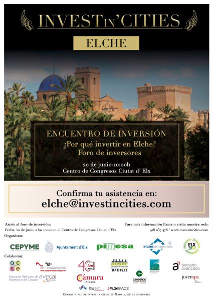 Adjuntamos a continuación el cartel del Encuentro de Inversión y rogamos confirmen su participación a través del siguiente correo electrónico y/o teléfono: elche@investincities.com / 91 805 74 78